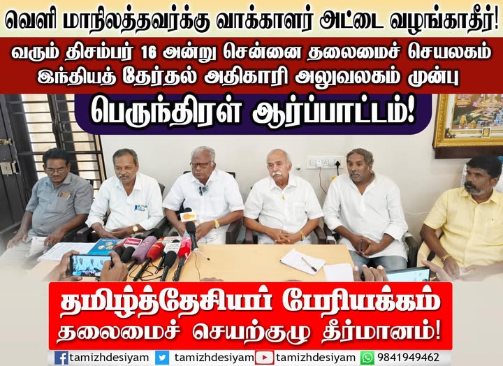 வெளி மாநிலத்தவர்க்கு வாக்காளர் அட்டை வழங்காதீர்! வரும் திசம்பர் 16 அன்று சென்னை தலைமைச் செயலகம் – இந்தியத் தேர்தல் அதிகாரி அலுவலகம் முன்பு பெருந்திரள் ஆர்ப்பாட்டம்!