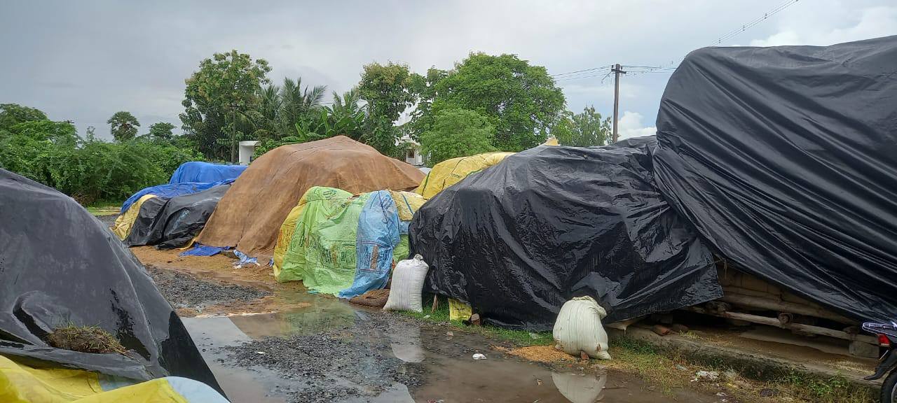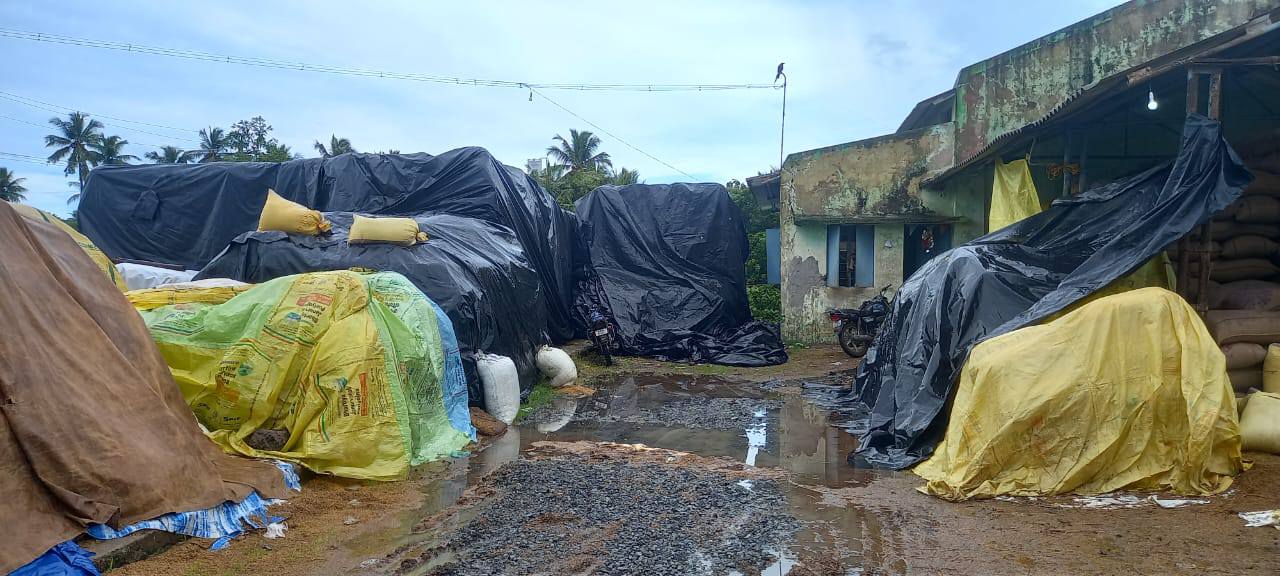 அறுவடைக்கு முன்பு மழையிலிருந்து தப்பித்த சிறு குறு விவசாயிகள், இன்று அறுவடை முடிந்து விற்பணைக்காக அரசு நேரடி நெல் கொள்முதல் நிலையத்தில் கொட்டி வைக்கப்பட்ட நெல்லையும், மூட்டைக்கட்டி அடிக்க வைக்கப்பட்ட நெல்லையும் மழையில் நனைய விட்டு வேதனையோடு காத்து இருக்கின்றனர்.