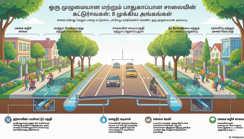 • முக்கியக் குறிப்பு: பெரும்பாலான இடங்களில் சாலையின் இந்தப் பகுதி மட்டுமே முறையாக அமைக்கப்படுகிறது. ஆனால், வாகன வழி மட்டும் ஒரு சாலையைப் பாதுகாப்பானதாக மாற்றிவிடாது.